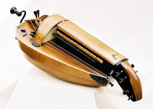 Vielle contemporaine avec : caisse ronde à 7 côtes érable et palissandre, table épicéa naturel, tour de table palissandre, capot de tête érable ondé, accastillage ébène et palissandre, placages érable ondé palissandre et décor personnalisé, vernis naturel satiné.