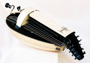 Vielle contemporaine avec : caisse ronde à 7 côtes érable et filets noirs, table épicéa teinté noir, tour de table nacre, capot de tête loupe d'orme, accastillage ébène, placages loupe d'orme, vernis teinté noir et caramel satiné.