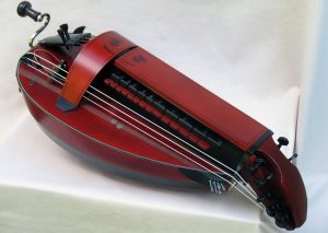 Vielle contemporaine avec : caisse ronde à 7 côtes érable ondé, teinté rouge/noir et filets d'ébène, table épicéa naturel teinté rouge, tour de table ébène et filets ébène/sycomore, tête érable ondé teinté rouge/noir et filets ébène/sycomore, accastillage ébène poli, placages érable ondé teinté rouge/noir et filets ébène/sycomore, sonorisation K&K 1 canal et sortie Jack 6.35, vernis rouge/noir.