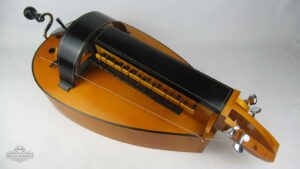 Vielle traditionnelle avec : caisse ronde à 9 côtes érable et palissandre, table épicéa encre noire, tour de table loupe d'orme, tête sculptée, accastillage ébène et cormier, placages érable teinté noir, vernis teinté ancien satiné.