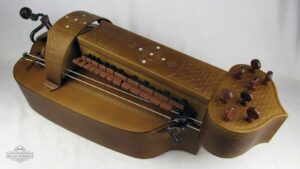 Vielle médiévale Alto avec : caisse plate grande trilobée érable ondé, table épicéa teinté caramel, tour de table palissandre, Tête érable ondé teinté caramel, accastillage palissandre poli, placages érable ondé poinçonné et sculpté, vernis teinté caramel, cellule Piezo K&K sur chanterelles avec sortie Jack 6.35.