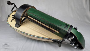 Vielle contemporaine avec : caisse ronde à 9 côtes érable ondé et filets d'ébène, table épicéa naturel, tour de table abalone verte et filets ébène/sycomore, tête érable ondé teinté vert émeraude, accastillage ébène poli, placages érable ondé teinté vert émeraude et filets sycomore, sonorisation K&K 1 canal et sortie Jack 6.35, vernis satiné naturel et vert émeraude.