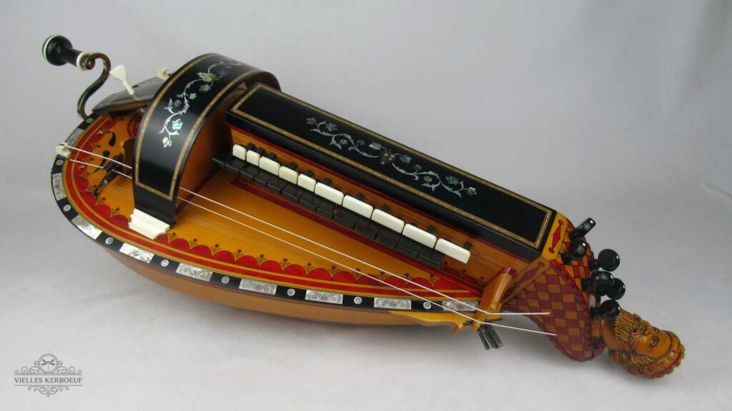 Vielle traditionnelle avec : caisse ronde à 9 côtes érable ondé et palissandre de Santos. Table épicéa teinté ancien, tour de table plaquettes de nacre blanche gravées avec ébène et pastilles, encrages rouges, tête sculptée homme turc Kerboeuf, accastillage ébène, os et nacre blanche, placages érable teinté noir et filets bois de rose, marqueterie de motifs Kerboeuf en nacre verte/blanche, vernis teinté ancien satiné.