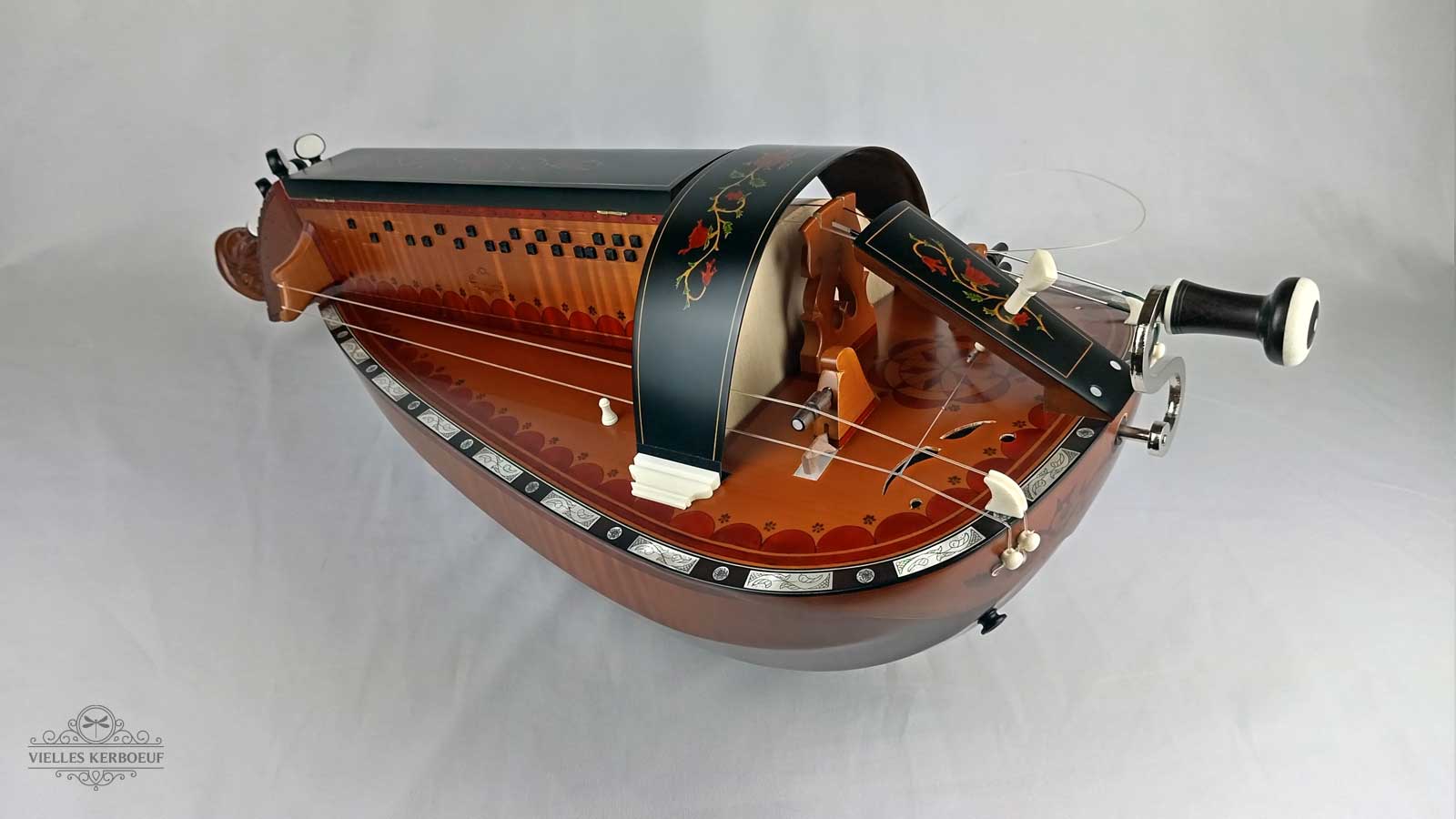 Vielle traditionnelle avec : caisse ronde à 9 côtes érable ondé et palissandre de Santos. Table épicéa teinté ancien, tour de table plaquettes de nacre blanche gravées avec ébène et pastilles, encrages rouges, tête sculptée homme à chapeau Kerboeuf, accastillage ébène, os et nacre blanche, placages érable teinté noir et filets sycomore, marqueterie de motifs en érable ondé et encrages, vernis teinté ancien satiné.